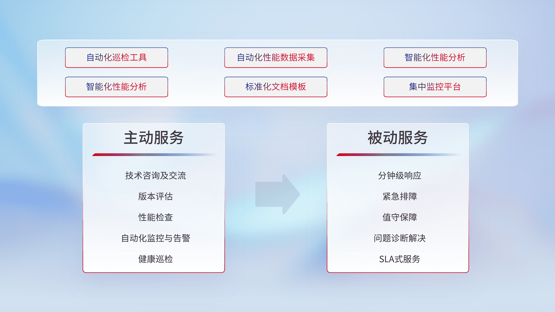 智能化工具和标准化文档,,保障服务质量,,,,提供主动服务(包含技术咨询、、、版本评估、、性能检查、、自动化监控与告警、、、、健康巡检)和被动服务包含(分钟级响应、、、、紧急排障、、、、值守保障、、、、问题诊断解决、、、SLA服务)。。